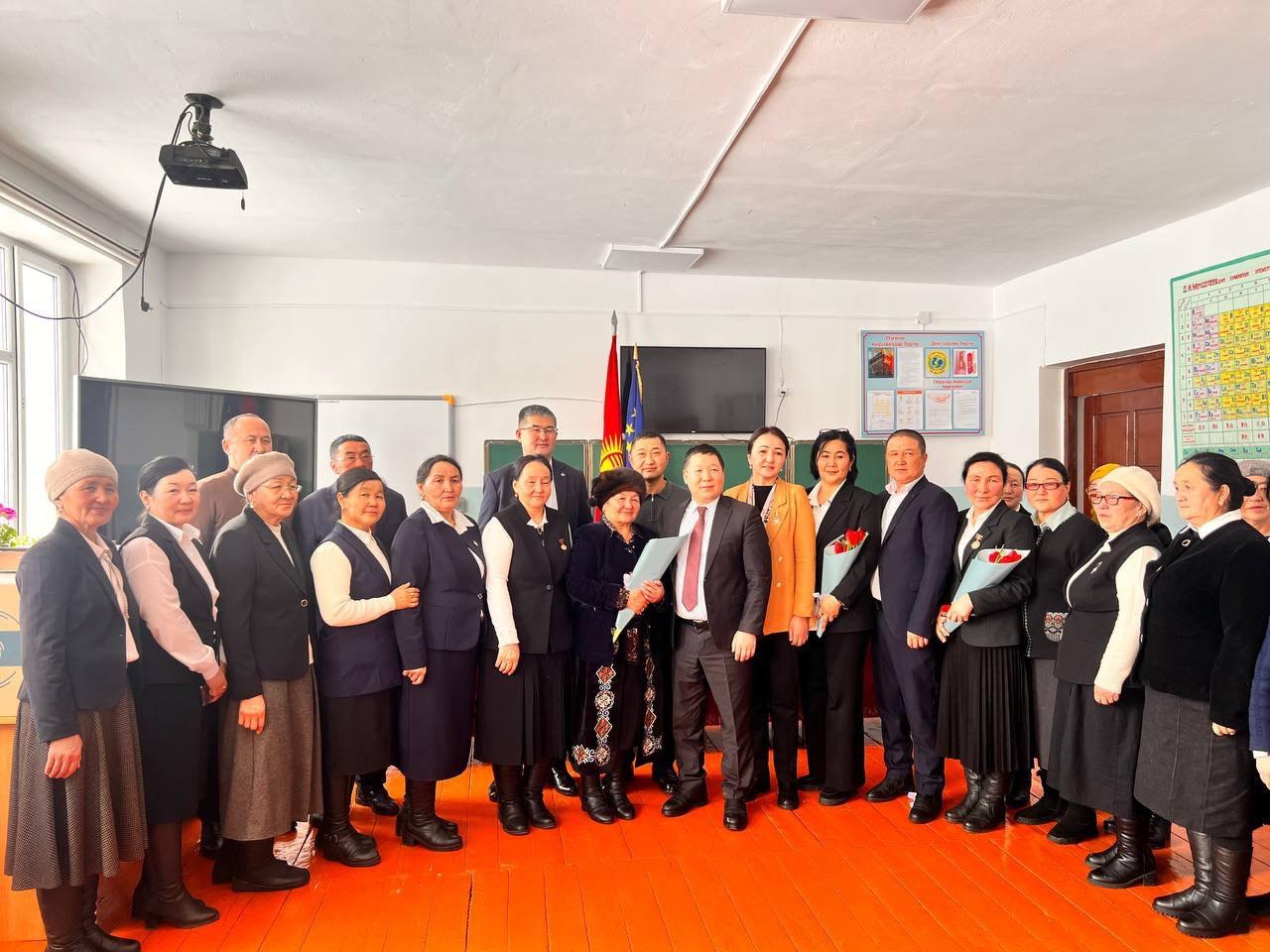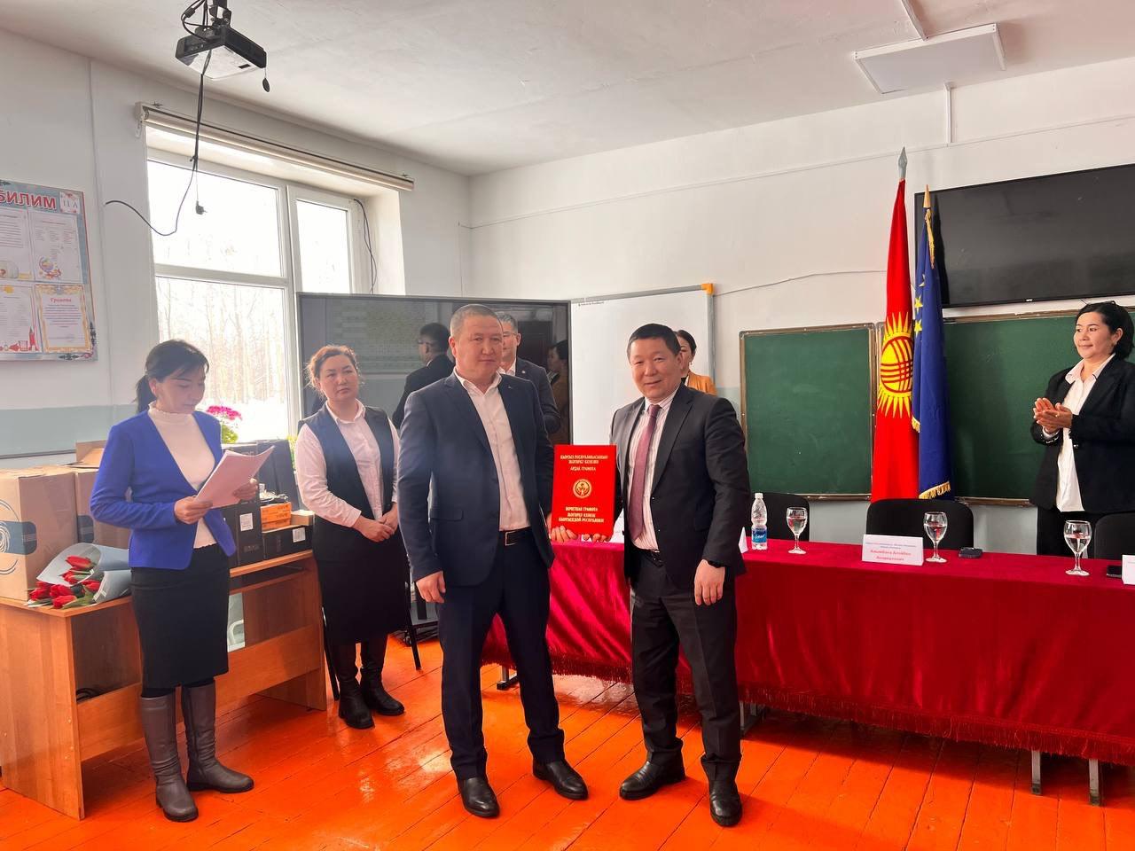 Кыргыз Республикасынын Жогорку Кеңешинин аппарат жетекчиси Алайбек Алымбаев Каныш -Кыя айылындагы С.Байдөөлөтов атындагы инновациялык жалпы орто билим берүүчү мектебинин материалдык базасын чыңдоо максатында 3 компьютер, 1 интерактивдик доска тапшырды.